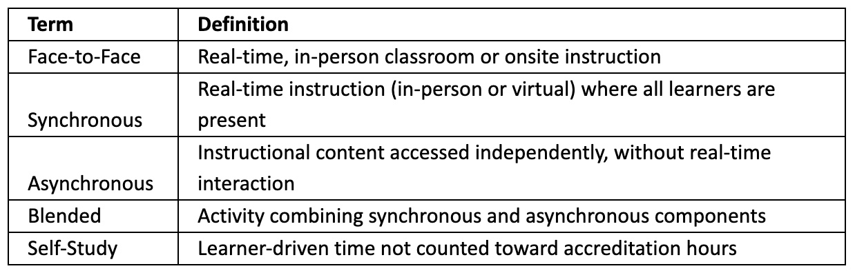 Synchronous learning reflects instruction where all participants are engaged at the same time, though not necessarily in the same place. It includes both in-person and virtual formats such as web conferencing, live video lectures, and virtual breakouts (Kumar & Eisenberg, 2023; Parslow, 2012).